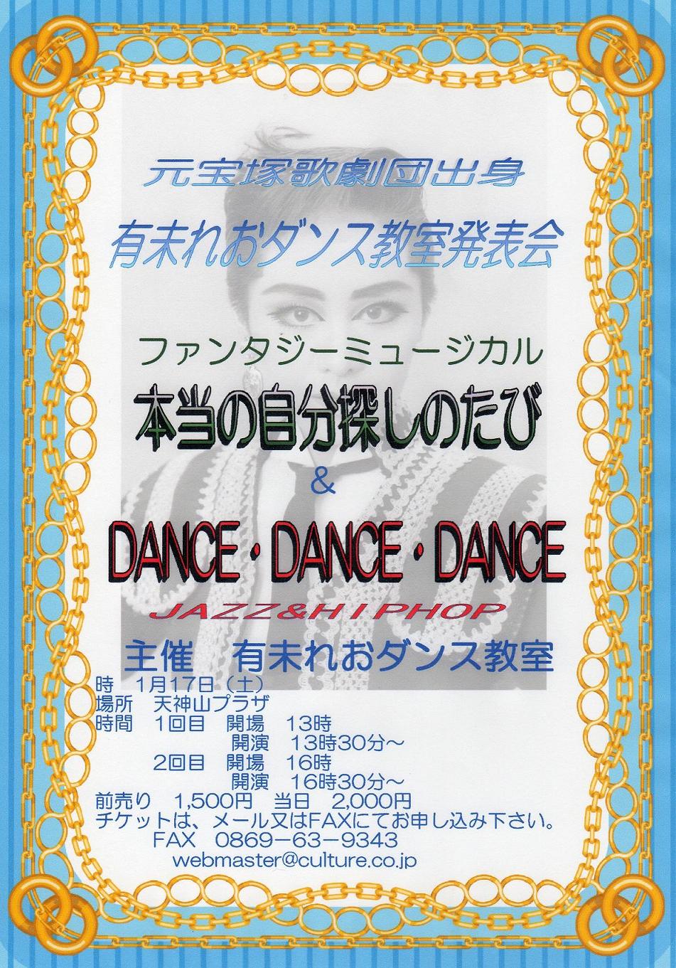 | × [PR]上記の広告は3ヶ月以上新規記事投稿のないブログに表示されています。新しい記事を書く事で広告が消えます。 天神山プラザでの発表会のチラシです。みなさーーーん、私も踊ります